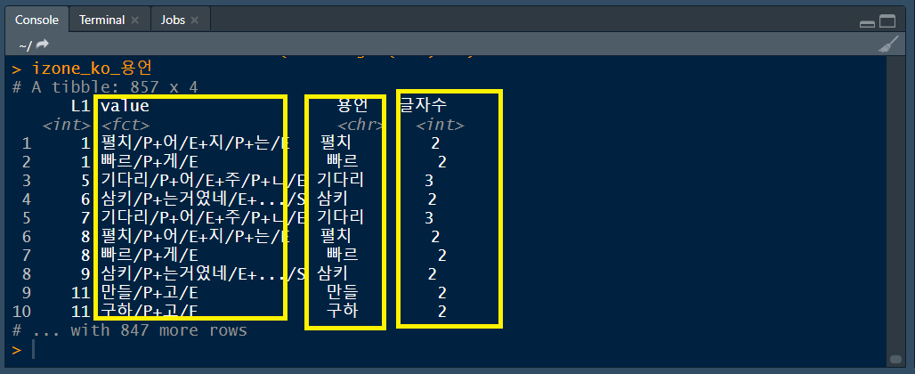 filter(str_length(용언)>=2) ## 2글자 이상만 추려냅니다아래와 같은 결과를 확인합니다